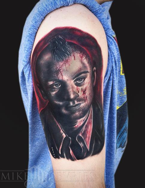 Taxi Driver tattoo. The photo had an interesting lighting source and it was hard to get a good photo. It looks dark but will heal lighter.