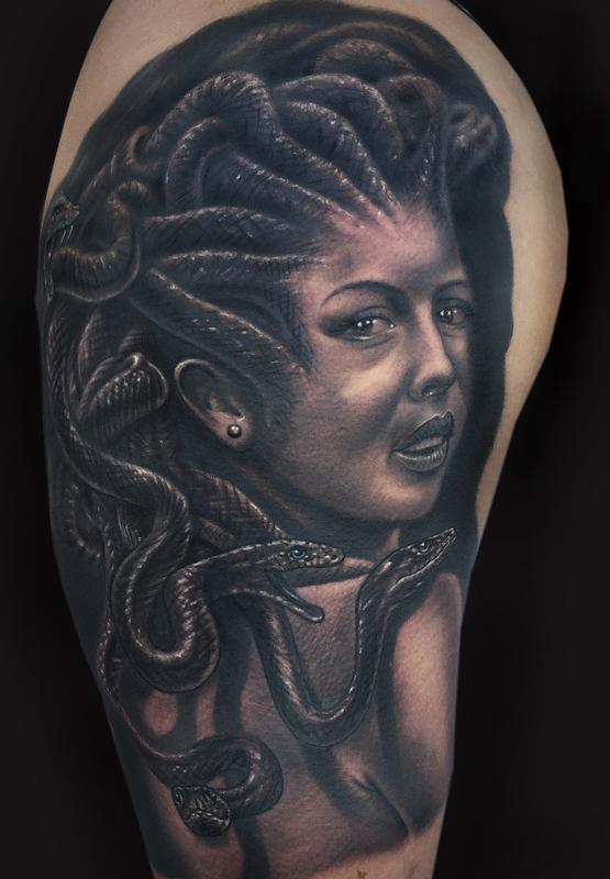 Finished this up yesterday - the client wanted his wife as Medusa. Some healed and some fresh.