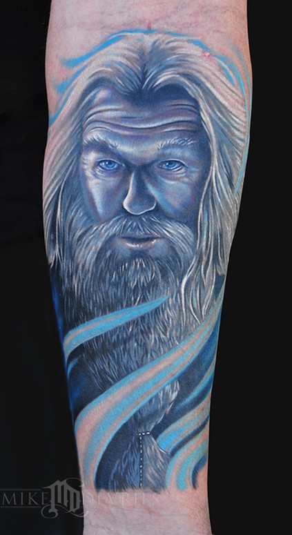 Wizard tattoo, referenced from Dumbledore from Harry Potter. Done in two sittings, first with coils, then finished him up with Hyper Stigmas on the second.