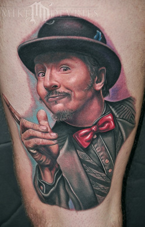 Portrait of Les Claypool from Primus. This tattoo is pretty big on a thigh! Used the Stigma Fly, Bizarre and the Hyper. 2010