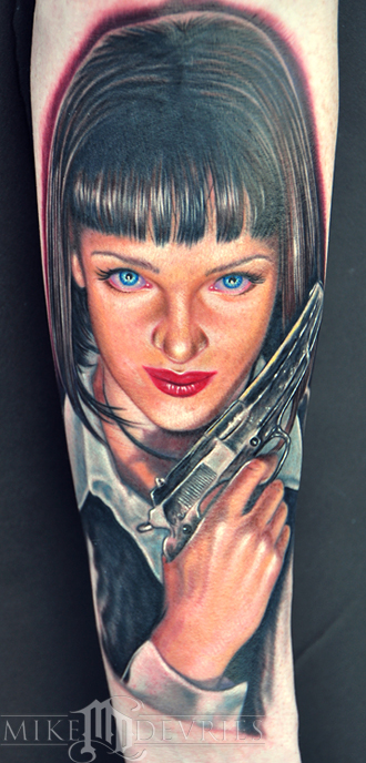Uma Thurman from Pulp Fiction, this is the second tattoo that will eventually be a full sleeve of Quentin Tarantino Movie Characters, the first one I did was the Brad Pitt from Inglorious bastards. Used the Stigma Fly and Hyper Machines and a lot of Skoal. 2010