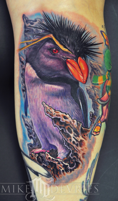 RockHopper Penguin Tattoo, had a lot of fun with this one, used all Eternal Ink with the Stigma Hyper machines. This was done in one session about 4.5 hours on the back of the leg, placed in between a few existing tattoos she already had. Shes collecting a leg full of Penguin Tattoos. Im hoping to make a second pass on this in the future to tighten some things up.