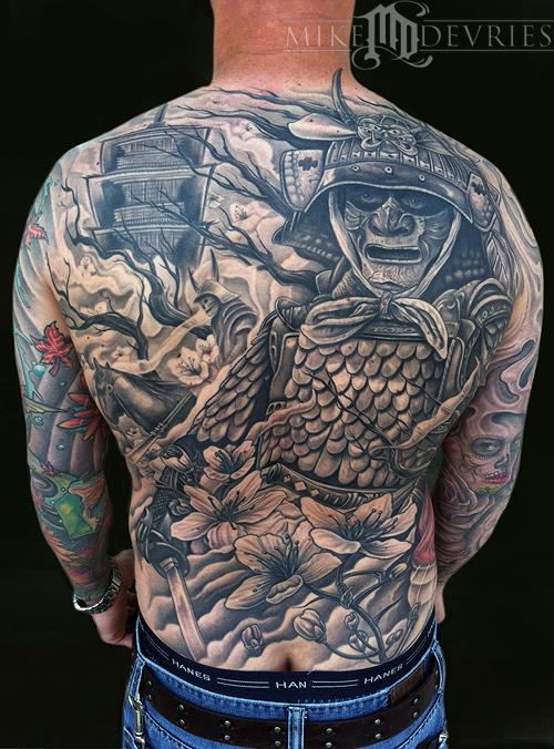 Samurai tattoo back piece ,did this on a really good friend of mine. Took a lot of hours to complete, I lost track of the hours and it technically needs another couple hours to be finalized but I'm happy with it enough to show it. In this photo its 100% healed.
