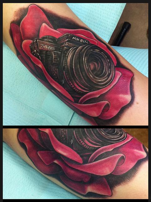 Did this tattoo on a Photographer named Melissa Palomo. This is a picture of her first Minolta camera that her Grandmother left her after she passed away when Melissa was just 13 years old.
