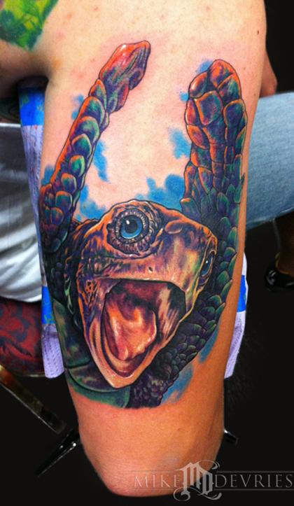 Did this Turtle tattoo at the Ink n Iron Festival on a cool guy from Australia. It's on the back side of his arm, tricep area. Had some fun with this one!