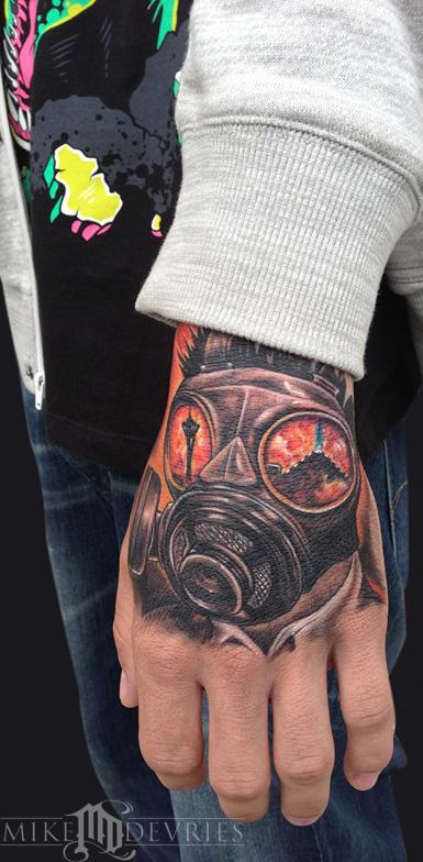 My client from Vegas brought me some gas mask photos to work with and wanted some Las Vegas images in the reflection, did some photoshop action. Strastosphere and the luxor were the main elements he wanted in there. A fun piece to do, I love doing hand tattoos! Used the new Eternal Ink, perfect black and the new Orange in the M series.