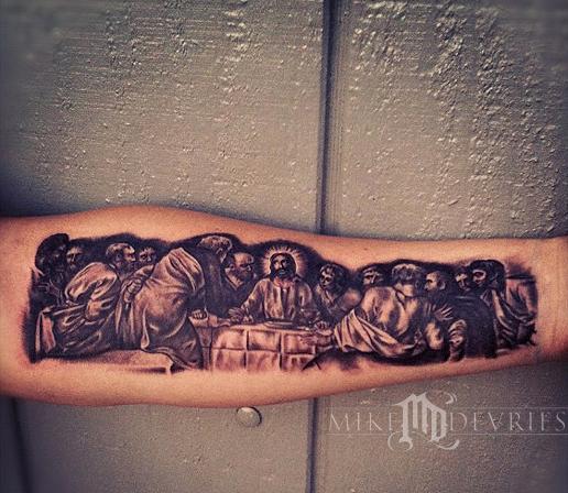 The Last Supper Tattoo done on the forearm. Definitely a challenging tattoo, especially this small, each face on this piece are sizes that range from the size of a dime to a quarter. Got it done in about 5-6 hours.