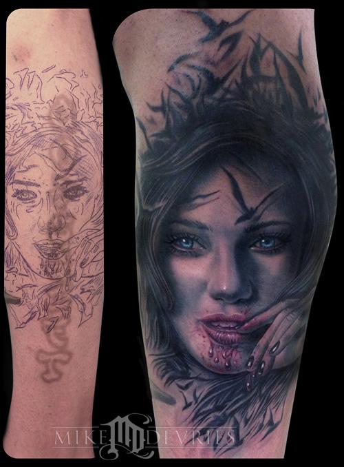 Cover up tattoo with an evil girl and some bat imagery. It was tough to get a good photo of this one for some reason. He had that old lettering tattoo hit 4 times with the laser before we did this, the pic on the left shows you what it looked like when we covered it. The bottom letter that wasnt covered will be dealt with next time, he wants a grave yard scene underneath...Fun Stuff!