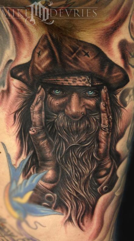 Did this pirate tattoo on a buddy of mine, creeps up into his armpit a little bit. The swallow tattoo below, I blurred it out because I didnt do that one.