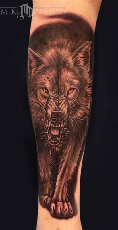 Fun Wolf tattoo! Used the new InkJecta Flite tattoo machine on this one. The wolf is from ankle to knee on the calf...Took about 7 hours to complete.