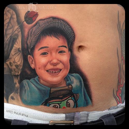 Did this tattoo of his son, next up a portrait of his daughter. Done on a friend of mine.