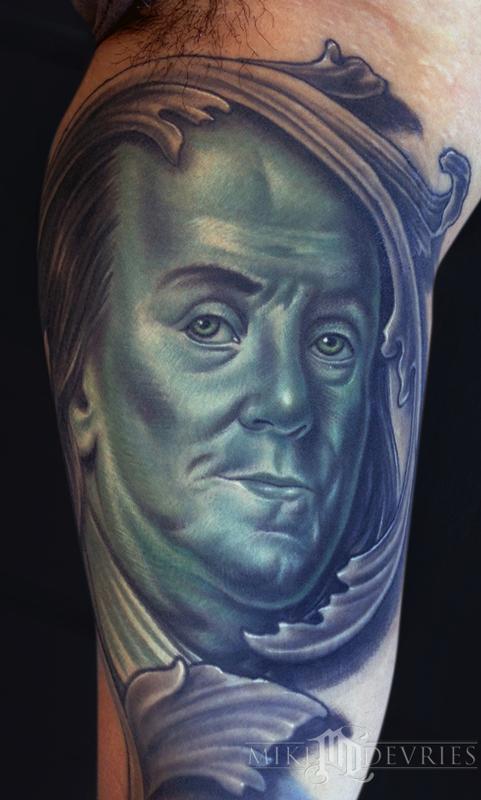 Ben Franklin portrait tattoo that is part of a sleeve I've been working on. Money and gambling theme. More pictures coming soon!