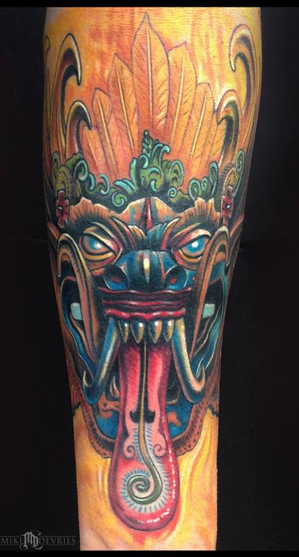Really fun tattoo! The guy I did this on brought me a print done by artist Phil Roberts titled "Bali Mask." We contacted Phil and asked permission to use it, he was stoked to hear that we were going to do one of his pieces on a collector of his own artwork.