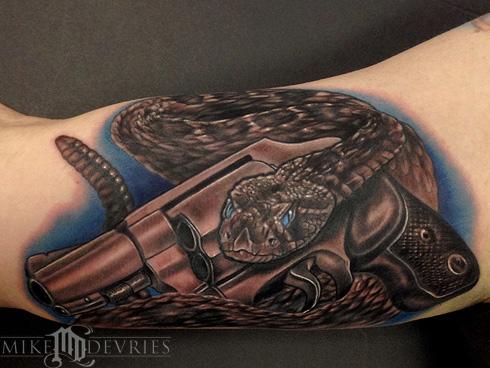 Did this on a cool guy that wanted something that resembled the whole "Don't Tread On Me" saying, without just writing it or just a gun tattoo so I put this together for him that resembles some of the ones that are out there but made it more realistic.