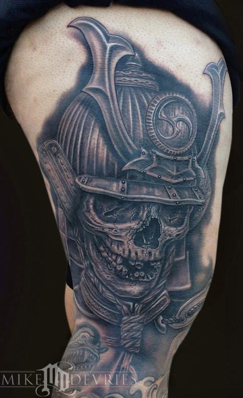 Samurai skull tattoo. Part of a leg sleeve. This tattoo is bigger than it looks, its about twenty inches tall.