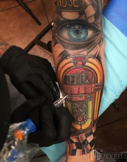 Vintage Wurlitzer jukebox tattoo. Got it pretty close but it still needs a couple more hours to complete it when it heals up, then onto the back of his arm.