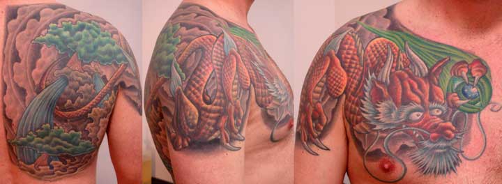 Comments: starting on his chest...onto arm, and back...this tattoo is actually covering up two pieces, one on the chest, one on his shoulder blade...had a great time doing this tattoo, and i'll be looking forward to our future plans to add more to his ribs, or maybe his sleeve...