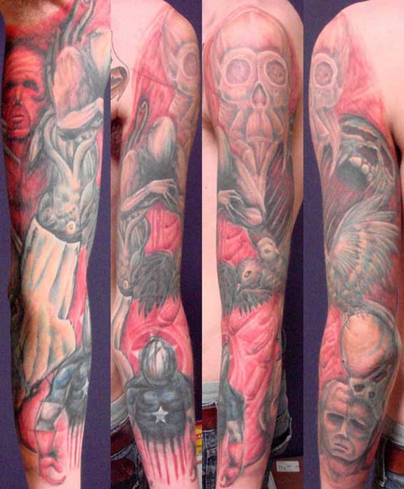 Comments: this started out as one small piece, for his first tattoo on his 18th birthday...a couple years later, his three quarter sleeve of derek hess's artwork is done...for now