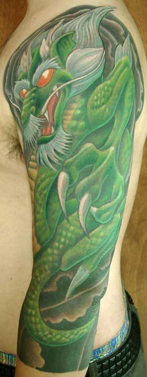 Comments: for his first tattoo, he wanted an interpretation of a traditional asian themed dragon sleeve...this is what he got...